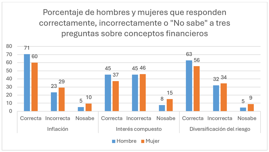 Es una realidad tajante que se observa en muchos países: las mujeres obtienen, de media, puntuaciones más bajas que los hombres en los indicadores habituales de conocimientos financieros. Y en España ocurre algo similar. Según la Encuesta de Competencias FinancierasAbre en ventana nueva, un porcentaje menor de mujeres comprende conceptos como la inflación, el interés compuesto o la diversificación del riesgo.